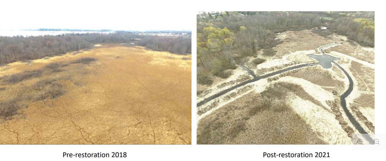 Before and after photo of wetlands restoration at Cranberry Pond. Photo: SUNY Brockport